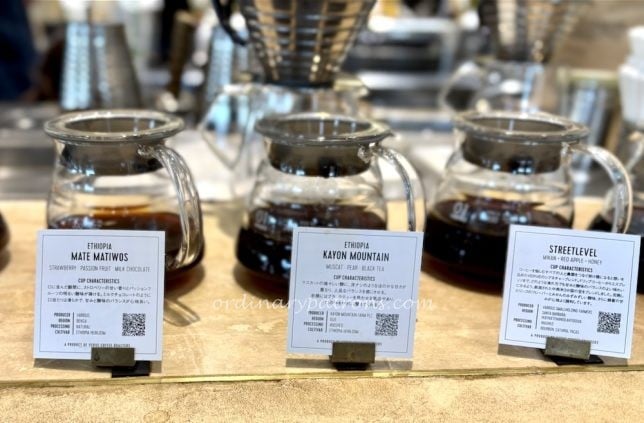 At Verve Coffee Roasters Ebisu, pots of coffee were ready-made for customers or would-be-customers to try before making a purchase. This was the first cafe we have been to which provides for coffee tasting before purchase. Like in Glitch, a friendly barista was on hand to explain the beans and to answer any questions.