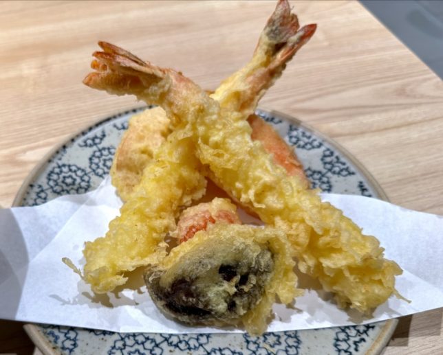 Accompanying the noodles was a small plate of tempura – two prawns and four vegetables. We had high expectations but the prawn tempura was quite average. The vegetable ones had more flavour and texture.