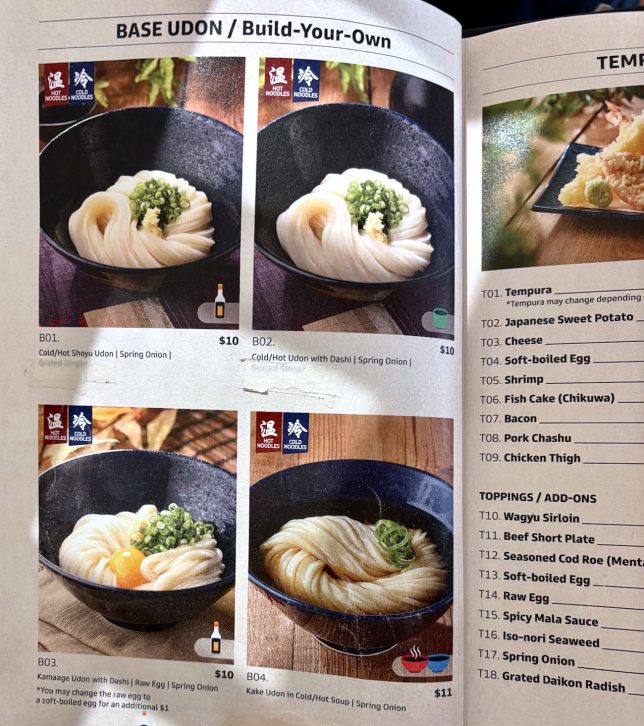 The pictures above are from the main part of the menu that contains various types of udon that have predetermined types of soup, toppings and condiments.