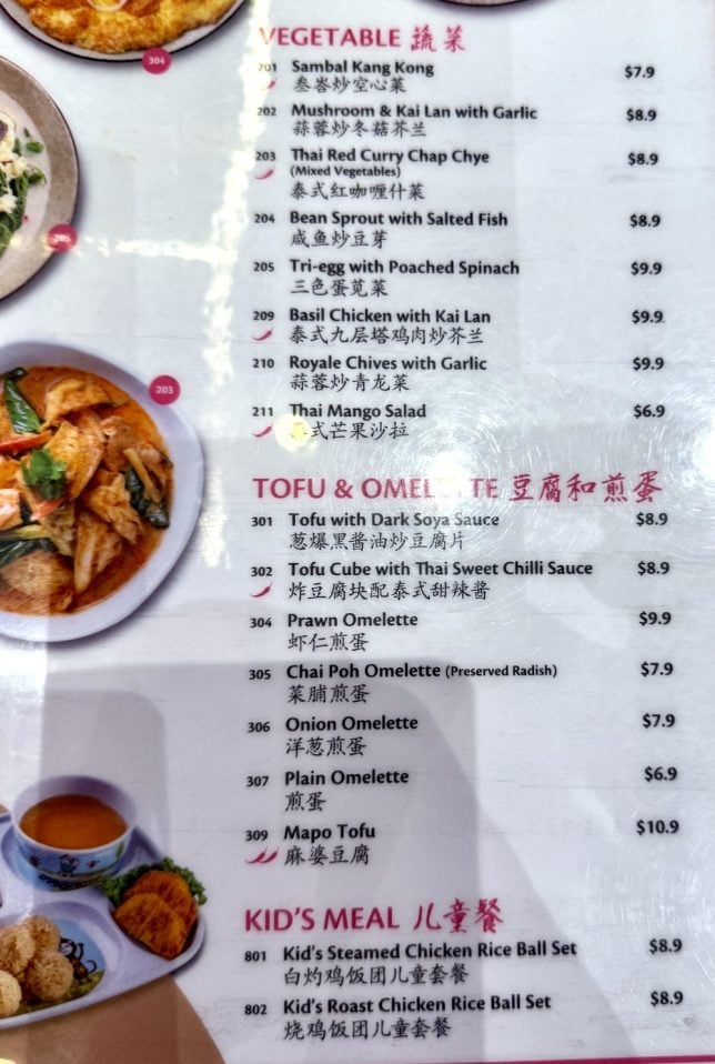 Here are pictures of some sample pages from the Go-Ang Pratunam Chicken Rice JEM menu. It seemed that the menu had been trimmed down since our 2022 visit. For this visit we selected the basil chicken with kai lan ($9.90), onion omelette ($7.90) and cashew chicken ($9.90).