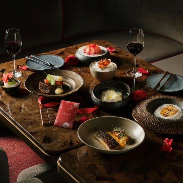 The Michelin-starred restaurant on the 70th floor of Swissôtel The Stamford offers both lunch and dinner on 13 and 14 February. The modern British menu includes black truffle and leek soup, Irish oyster with Kristal caviar, roasted blue lobster tail with aged parmesan, and dry-aged Wagyu fillet with fig-glazed foie gras. Dinner features wild-caught John Dory fillet with king crab leg. The experience concludes with warm chocolate mousse and white caramel ice cream.