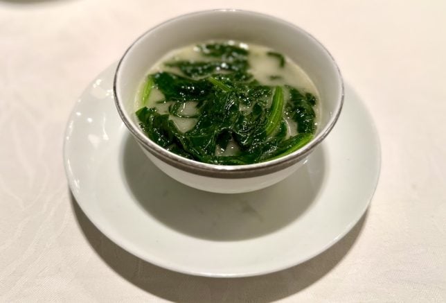 By this time we were getting the impression that we were not going to get spectacular food photos. The appearance of the food did not seem to be of a high priority at this restaurant. Next to arrive was the soup of the day which was a pork based soup (picture above). It has brains but not much beauty. Likewise for the vegetable dish – seasonal vegetables braised in chicken stock (picture below).