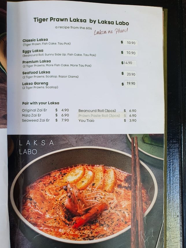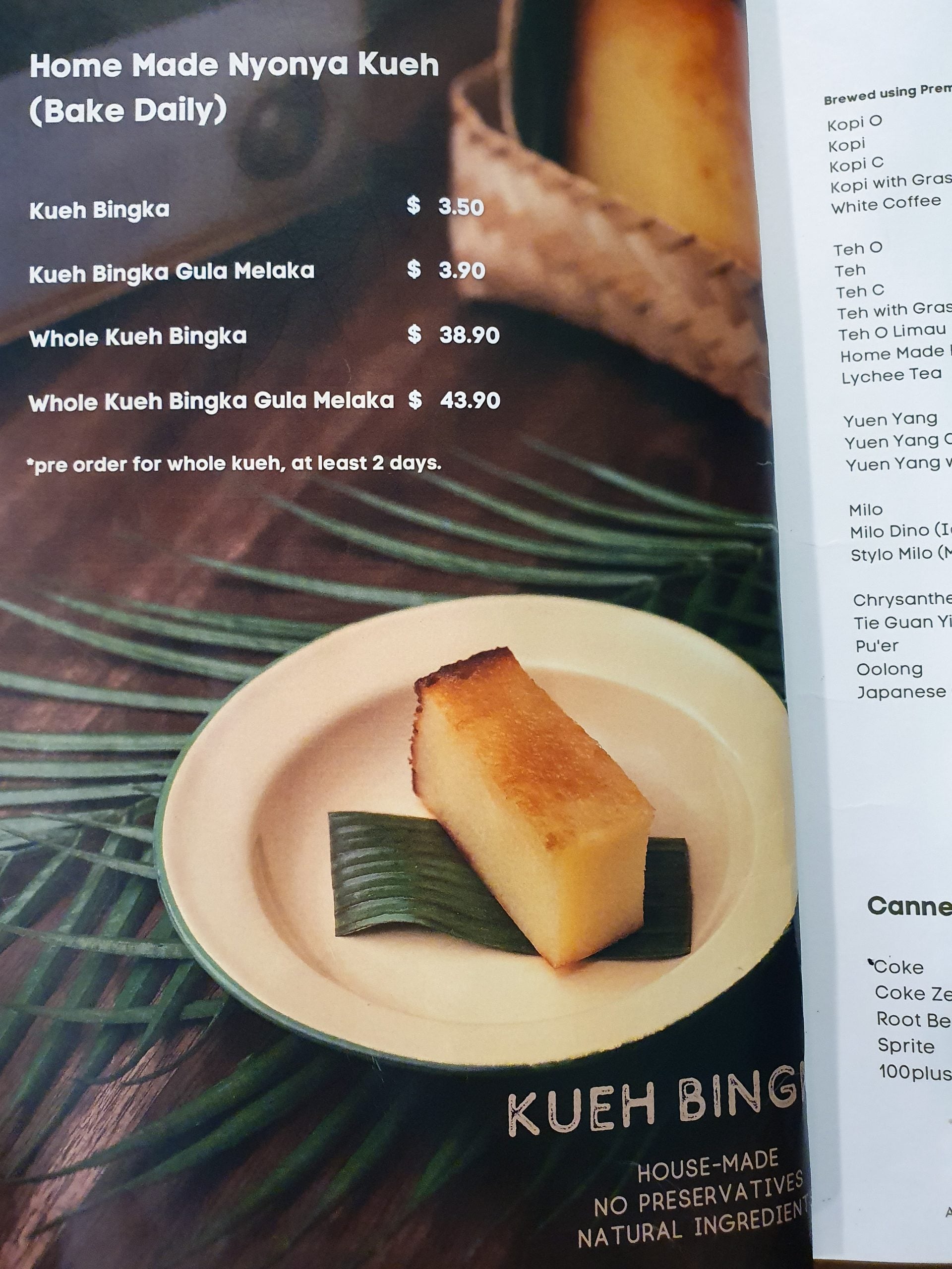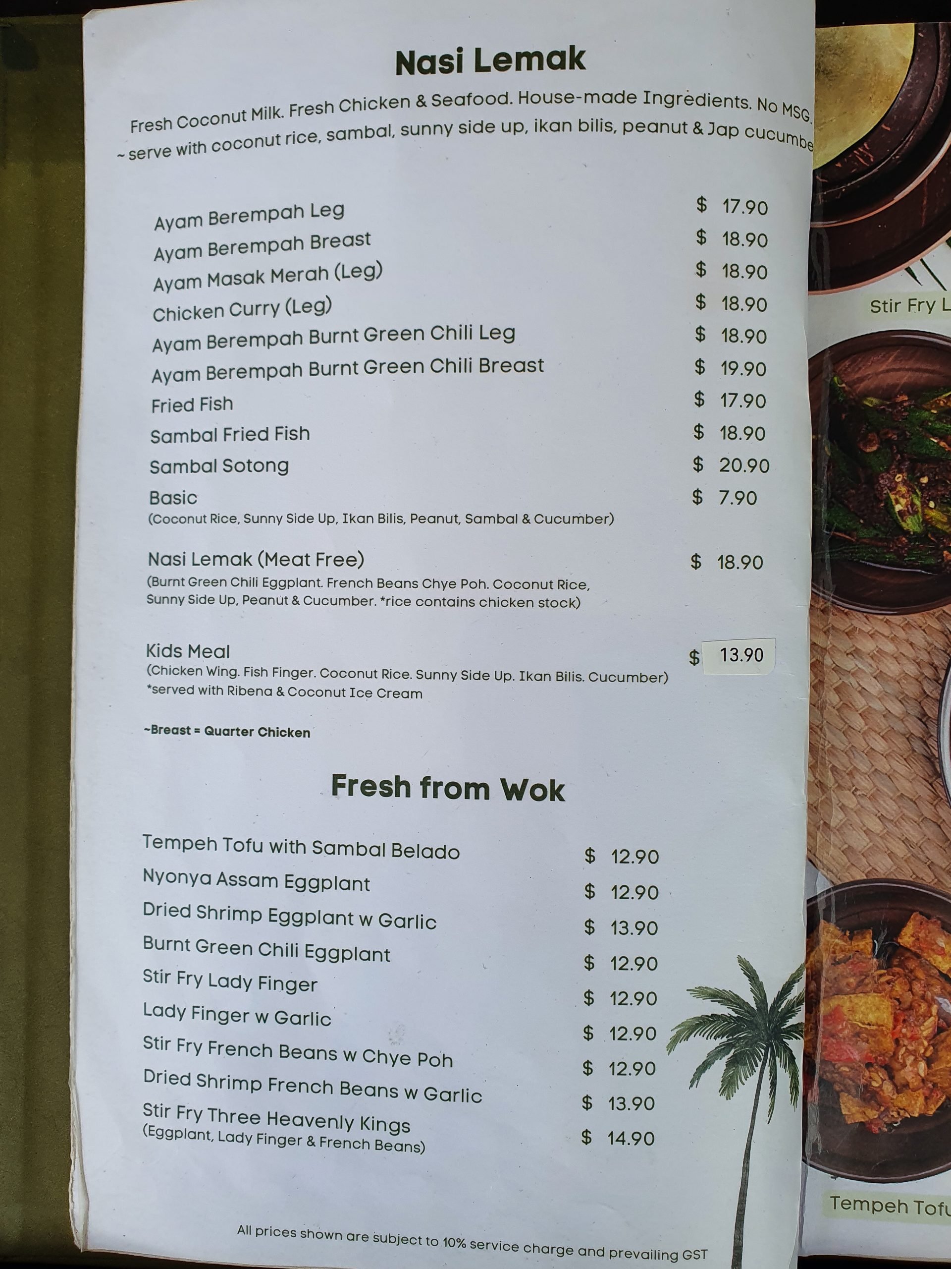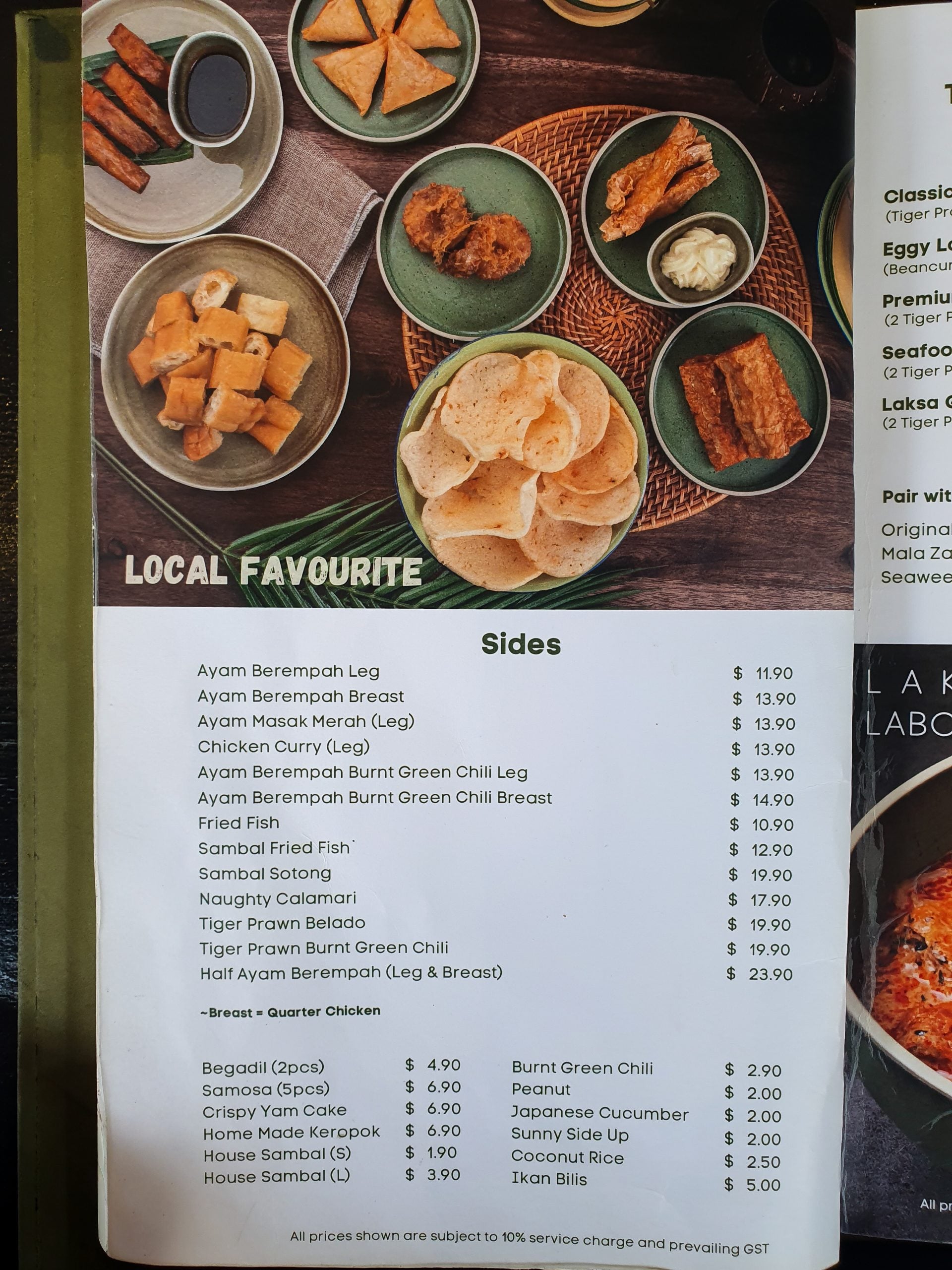 The menu focuses on a few signature categories rather than an overwhelming list of options. It highlights local street food reimagined with a slight premium touch. There is a list of nasi lemak and a selection of laksa. Sides, one dish meals, and desserts are also available.