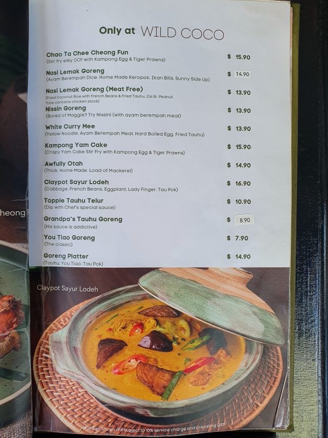 Many “atas” (higher-end) restaurants in Singapore now serve elevated versions of nasi lemak and other street food at premium “atas” prices. However, Wild Coco maintains a balance between a restaurant setting and reasonable pricing. It provides a comfortable, air-conditioned environment for diners, with prices for laksa starting at $10.90 while the most basic nasi lemak is priced at $7.90.