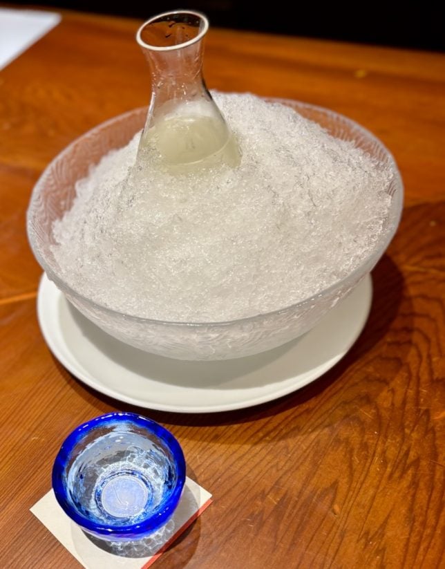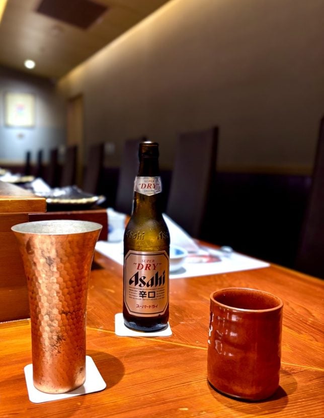 Cold beer served in a cold metal glass tasted even colder than usual. It made the common Asahi super dry taste much better than usual, Cold sake served in 180 ml sizes were smothered with crushed ice to stay adequately chilled throughout the meal.