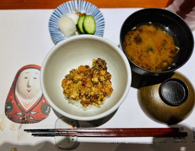 Finally the arrival of the rice (tendon) and miso soup dishes marked the ending of the meal.