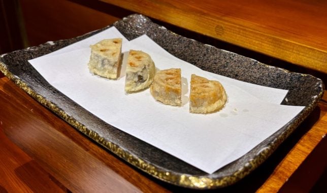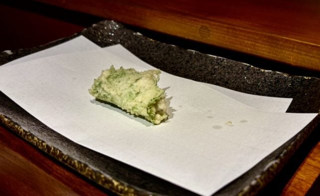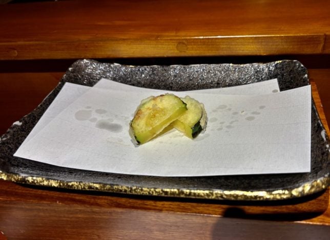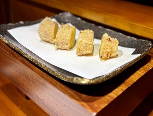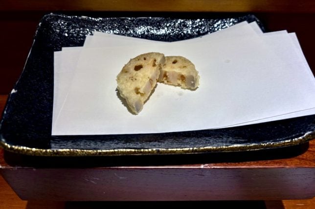 Next came the vegetable items. These were so good that we ordered extra sweet potato and lotus root items from the a la carte menu. They make perfect snacks to eat with beer or sake.