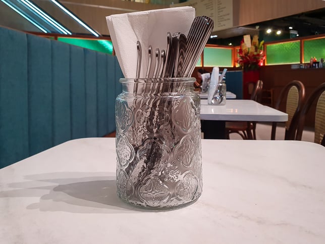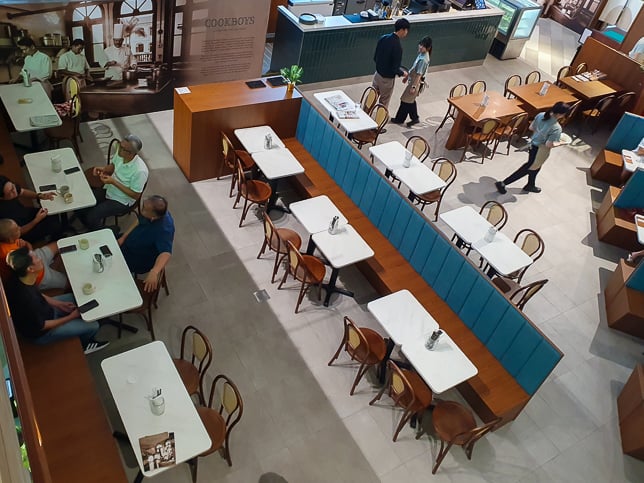 The design leans into a “modern heritage” aesthetic, moving away from the utilitarian cafeteria look of standard Han’s outlets. In its place are warm wood panelling and teal-blue built-in bench seating that adds a welcome splash of colour.