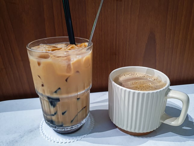 We ordered the Herb-marinated Bone-in Pork Chop ($15) and Hokkien Mee with Tiger Prawns ($14.50), as well as Kopi ($3) and Iced Teh with Grass Jelly ($5).
