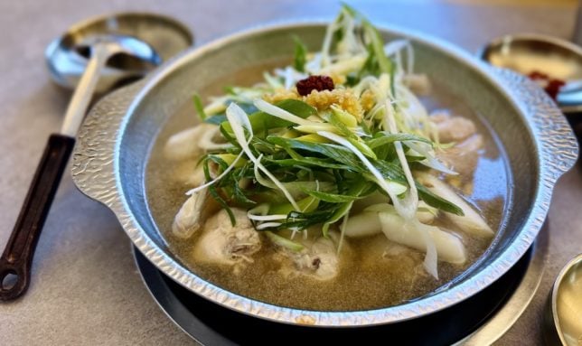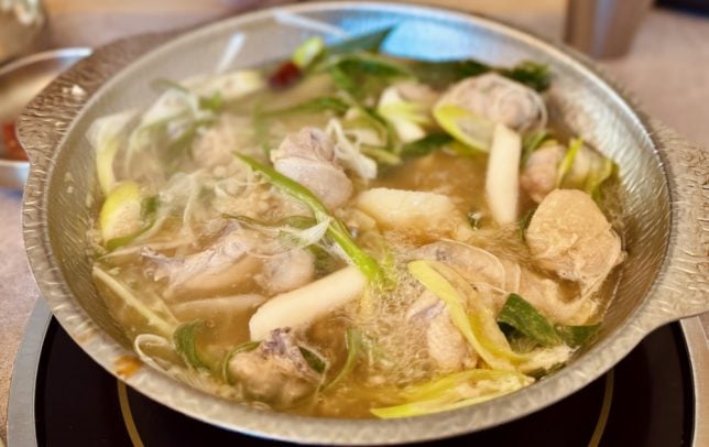 The main event arrived soon after. A pot of dak-hanmari (닭한마리) was placed on top of the induction stove in the middle of the table. The pot contained pieces of cooked chicken in chicken soup, topped with a generous amount of leeks.