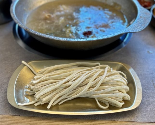 Once the main contents were eaten, it was time to start up the stove and add the kalguksu. With the noodles soaking up the tasty broth, they tasted wonderful. So much so that we forgot to take pictures of the cooked noodles. This is a picture of the uncooked noodles before their swimming lesson. A satisfying meal for two costing a total of KRW31,000 (no extras for tax etc were added to the menu price).