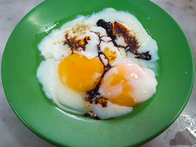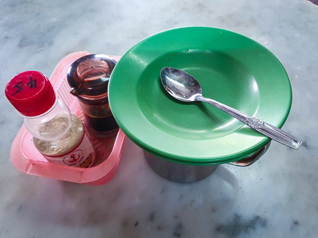 The way the half-boiled eggs ($1.80) were served felt particularly nostalgic. Rather than cracking them for us, the staff presented a stainless steel mug filled with hot water, two whole eggs submerged inside, covered by a green plastic plate with a spoon resting on top. A small plastic basket held the dark soy sauce and white pepper.