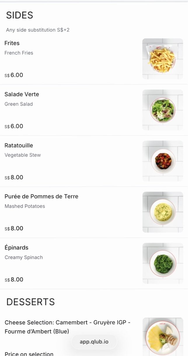 The entire restaurant menu is available online. Here are some pictures taken off the QR menu at the restaurant. Prices are indeed affordable especially in the Orchard Road context. Prices for side dishes range from $6 to $16. The most expensive main course is the steak that costs $28++.