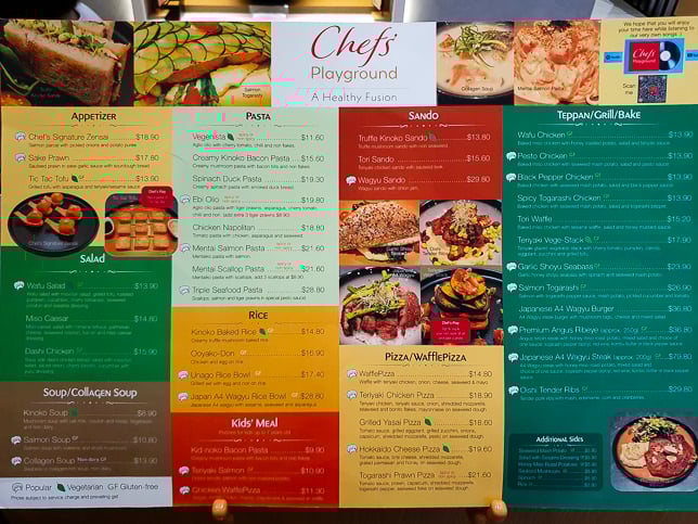 Chefsโ Playground is an all-day dining EuroJapanese cafe/restaurant. On its menu are Pasta, Pizza and Teppan mains as well as Desserts like Creme Brulee, Matcha Cheese Cake, Waffle and Fruit Granola.