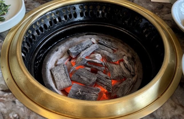The stove was set up by our server who placed the nicely heated up (glowing without smoke) charcoal in place. She also did the cooking, apportioned and served the meat to us. This is a picture of my half of the meat. The Korean beef was cooked to medium and had a soft texture. Its flavour was nice but not as distinctive as I imagined it to be. This was sufficient for us to tick the box to experience premium Korean BBQ in Seoul.