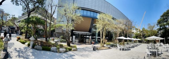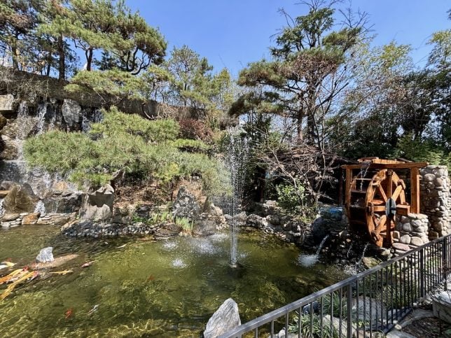 Outside the building there are outdoor furniture and an ornate koi pond with fountains and even a wooden decorative water wheel.