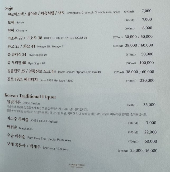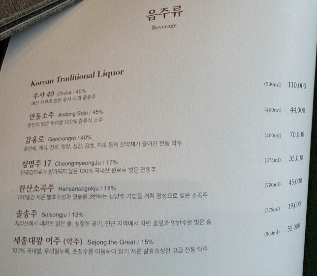 We selected one of the more affordable options – a small bottle (375ml) of s์์ก์ฃผ Solsongju (KRW19,000). It was an easy going light rice wine with a mild herbal scent. It had an alcohol content of 13% (similar to wine).