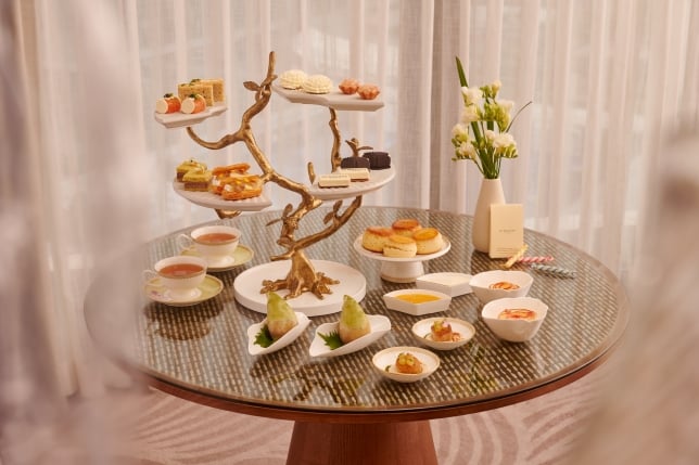 In collaboration with Jo Malone London, the hotel presents the “Bloom and Reverie” afternoon tea. The menu features jasmine-infused chicken and a black lemon fan-shaped pastry.