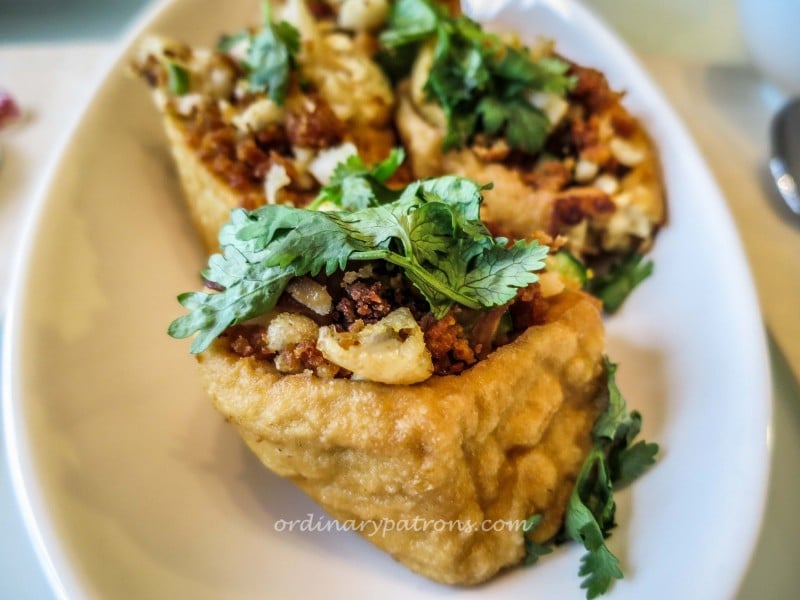 Tau Kwa Pau : Bean curd crisply fried and stuffed with a filling of chopped crispy fish cake, egg, cucumber and fried yam. Served with gravy and chilli sauce.