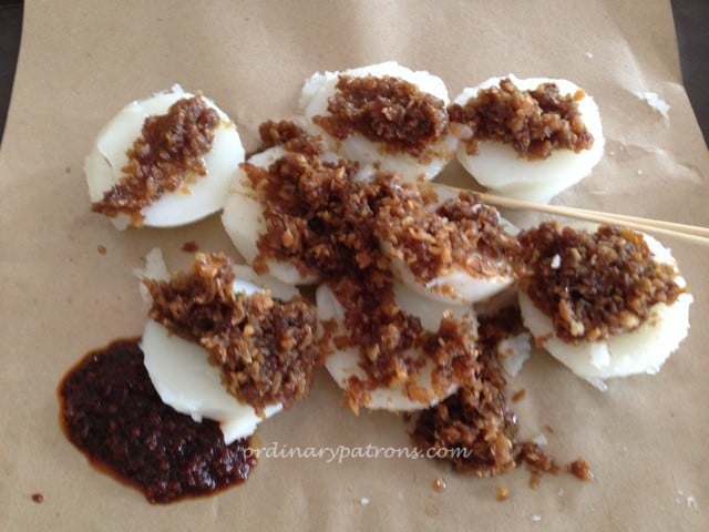Chwee Kueh : Literally means water rice cake; it is a saucer-shaped steamed rice cake topped with diced preserved radish and served with chilli sauce.
