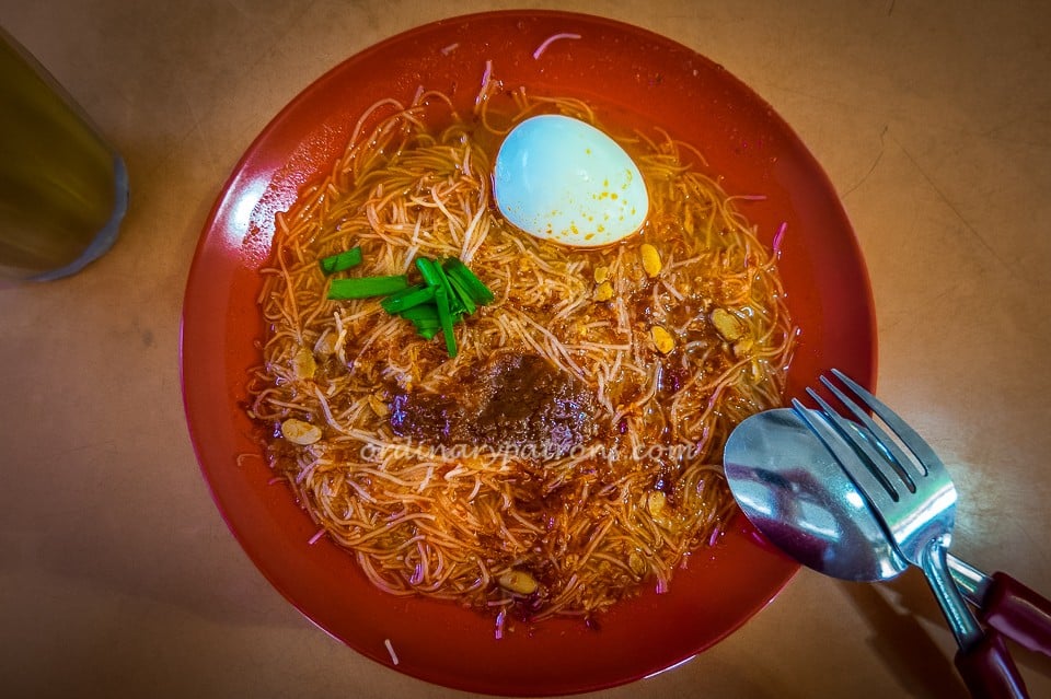 Mee Siam : A noodle dish where a slight sweet-tangy gravy is poured over a plate of fine rice noodles (bee hoon) which had been seasoned. The dish is often garnished with boiled eggs and spring onions.