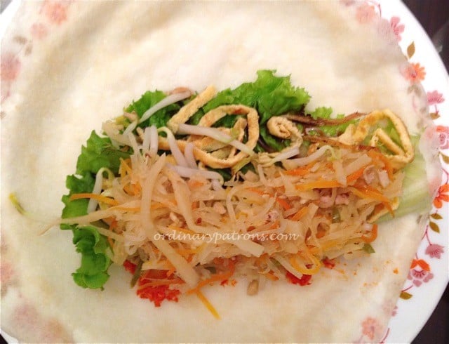 Popiah : A Spring Roll where the popiah “skin” is a soft, thin paper-like crepe or pancake made from wheat flour and main filling for the popiah is a complex mix of many ingredients which turnip, carrot, French beans, bamboo shoots, fried tau kwa, prawns and pork. Toppings may include chinese sausages, bean sprouts, omelette strips, hard-boiled egg, chilli paste, sweet sauce, garlic and lettuce.