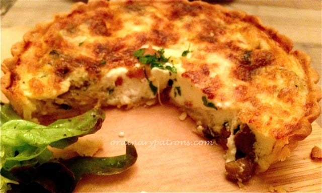 Quiche : A baked opened face pie with a savoury filling (such as cheese, ham, spinach, mushroom, or seafood) thickened with eggs.