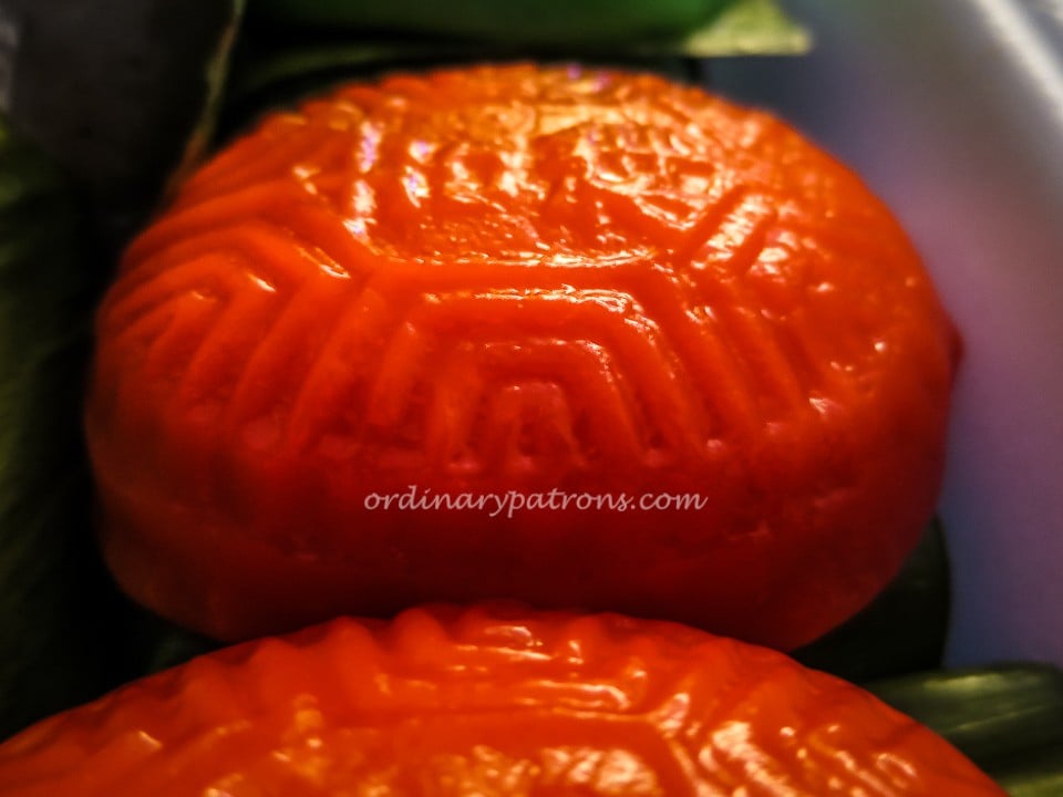 Ang Ku Kueh : Literally means Red Tortoise Cake. A small Chinese pastry having a soft sticky glutinous rice flour skin with a sweet filling of bean or peanuts. It is molded to resemble a tortoise shell and is traditionally considered auspicious as it symbolises longevity and good fortune.