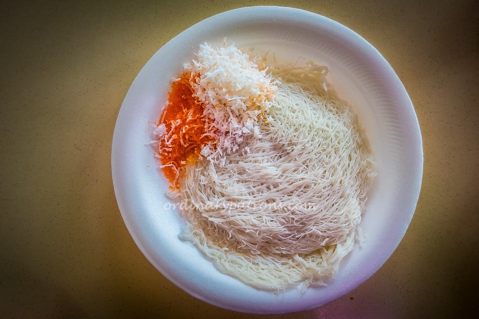 Putu Mayam: A South Indian snack of plain white noodles made of rice flour mixed with salt and water. The steamed noodles are eaten with coconut shavings and brown or red sugar.